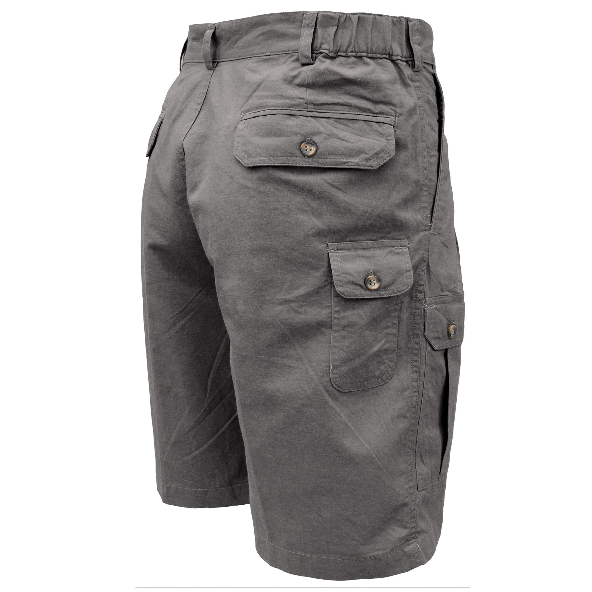 Our Adventure Shorts for men, with dual cargo pockets and a 9” inseam, are safari shorts designed for the ultimate in outdoor comfort and flexibility. Two cargo pockets in front with button down flaps, two more in back, plus two slip in pockets on the side, provide generous storage for essential travel gear. A single flap covered utility pocket on the hip is perfect for a pocket knife or multipurpose tool. Front pleats and discreet side elastic panels afford flexibility for active lifestyles. Durably double stitched and generously sized. Made in Africa from garment washed and pigment dyed 100% cotton. These men’s adventure shorts, with a longer inseam, are the perfect choice for hunting, trail walks, mountain hiking, or any other demanding safari related activity.
